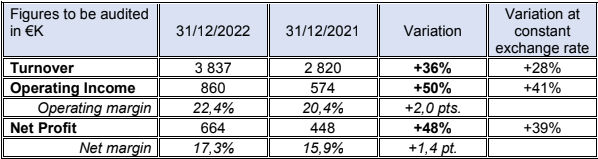 Operating income was €860 K, up 50% on 2021. Thanks to a 100% outsourced model, Samba Digital takes advantage of a favourable volume effect allowing it to absorb its fixed costs in better conditions.