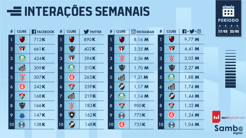 Flamengo must have put in a lot of effort this week as their performance has improved by 33% in that time. Not only has their performance improved, but so have their interactions, as they have passed 10 million in just seven days. Palmeiras looms in their shadow with a nearly 48% drop and Santos close behind with a 50% decrease.