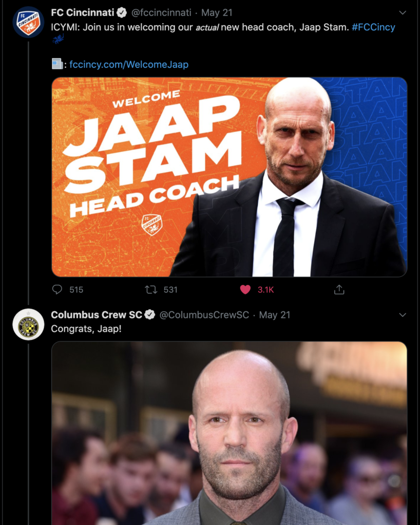 When the official announcement photo was changed and fixed, other clubs in the league had some fun with it, as the Columbus Crew and the New York Red Bulls replied with different bald celebrities to joke about the latest Dutch managerial appointment to MLS.